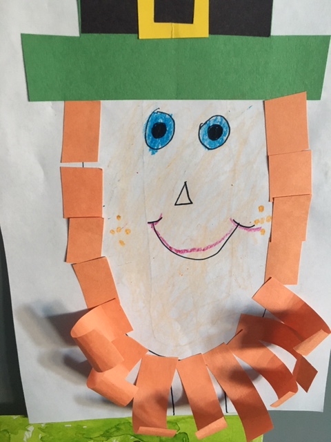 St. Patrick’s Day–its important that children draw and cut and glue themselves. If they say “I can’t” I coax them along.